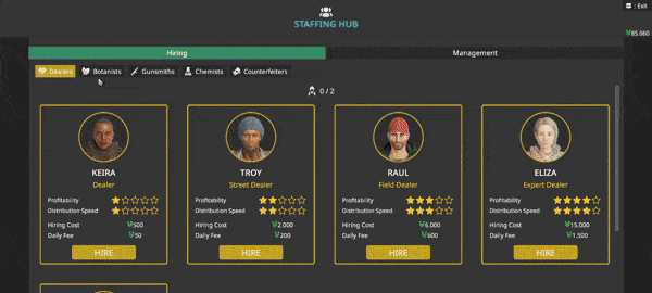 Hire workers to grow plants, produce chemical drugs, and manufacture weapons, then hire street dealers to handle drug sales across the city.